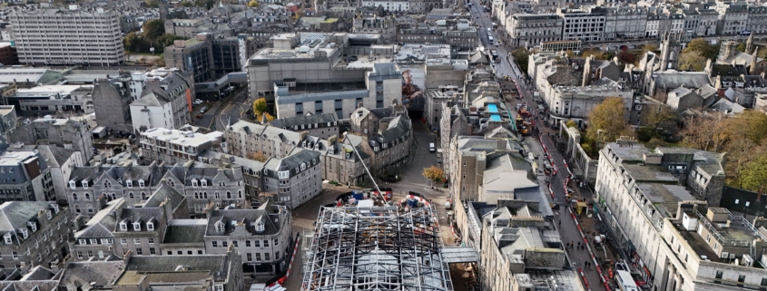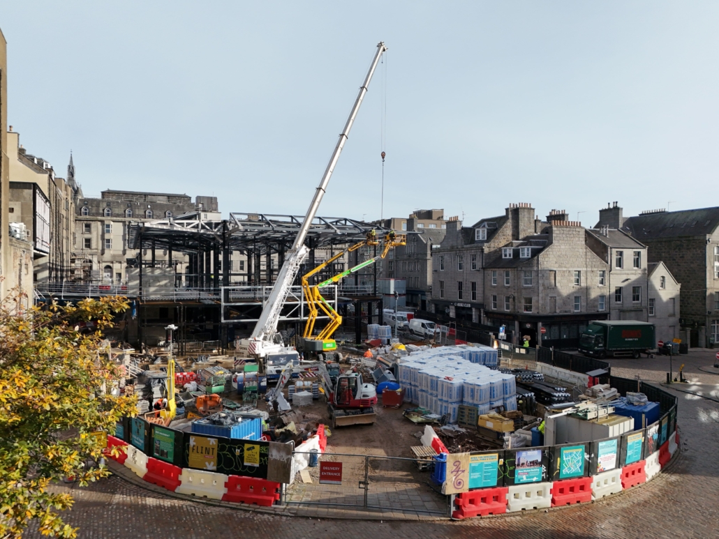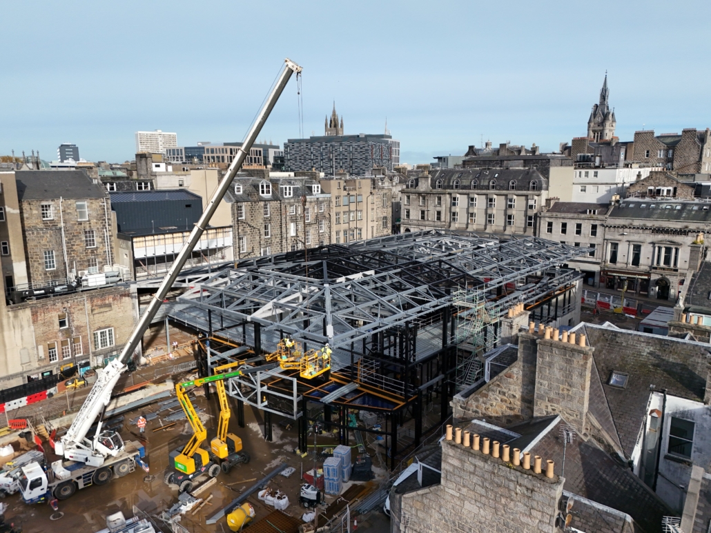 The steel frame, which is being supplied by local business KR Group, is almost complete and the link bridge to the market frontage on Union Street can be clearly seen taking shape.